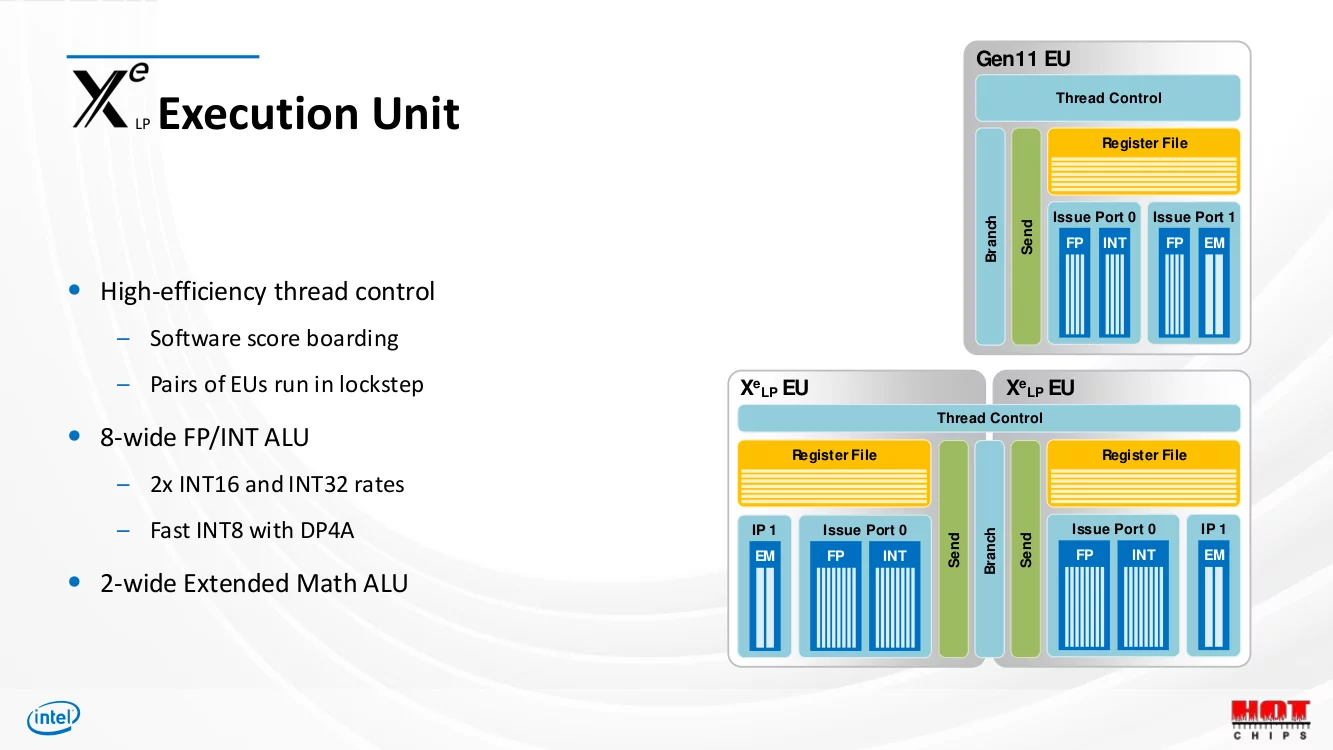 Xe-LP EU (Execution Unit) は以下のように、命令を発行する Issue Port 0 は FP/INT演算器を、Port 1 は三角関数等の超越関数を実行する EM (Extended Math)演算器を担当する構成となっている。